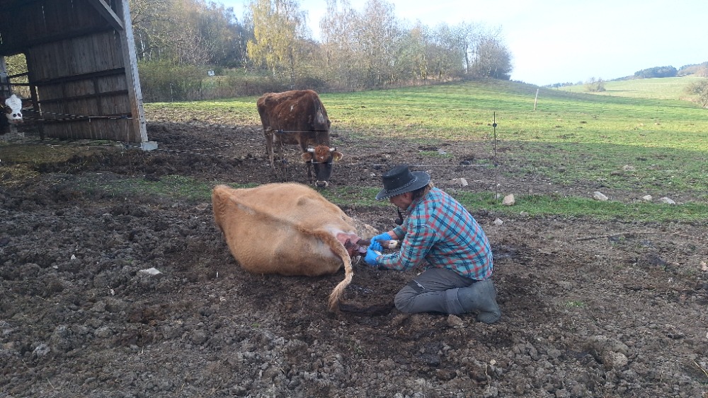 Když se tedy Jasmínka opět položila, aby mohla tlačit, přispěchal Honza a mírným tahem v době kontrakce pomohl telátku na svět.