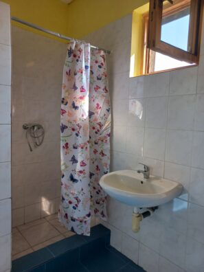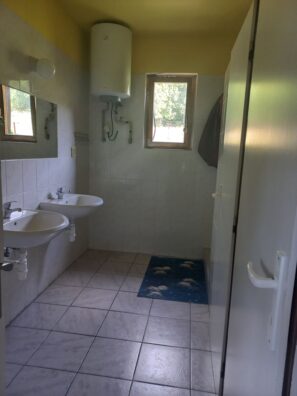 K Ovečce patří vlastní koupelna s WC, která je od domku asi 15 kroků. Koupelna je zděná, prostorná a budete ji mít jen sami pro sebe.